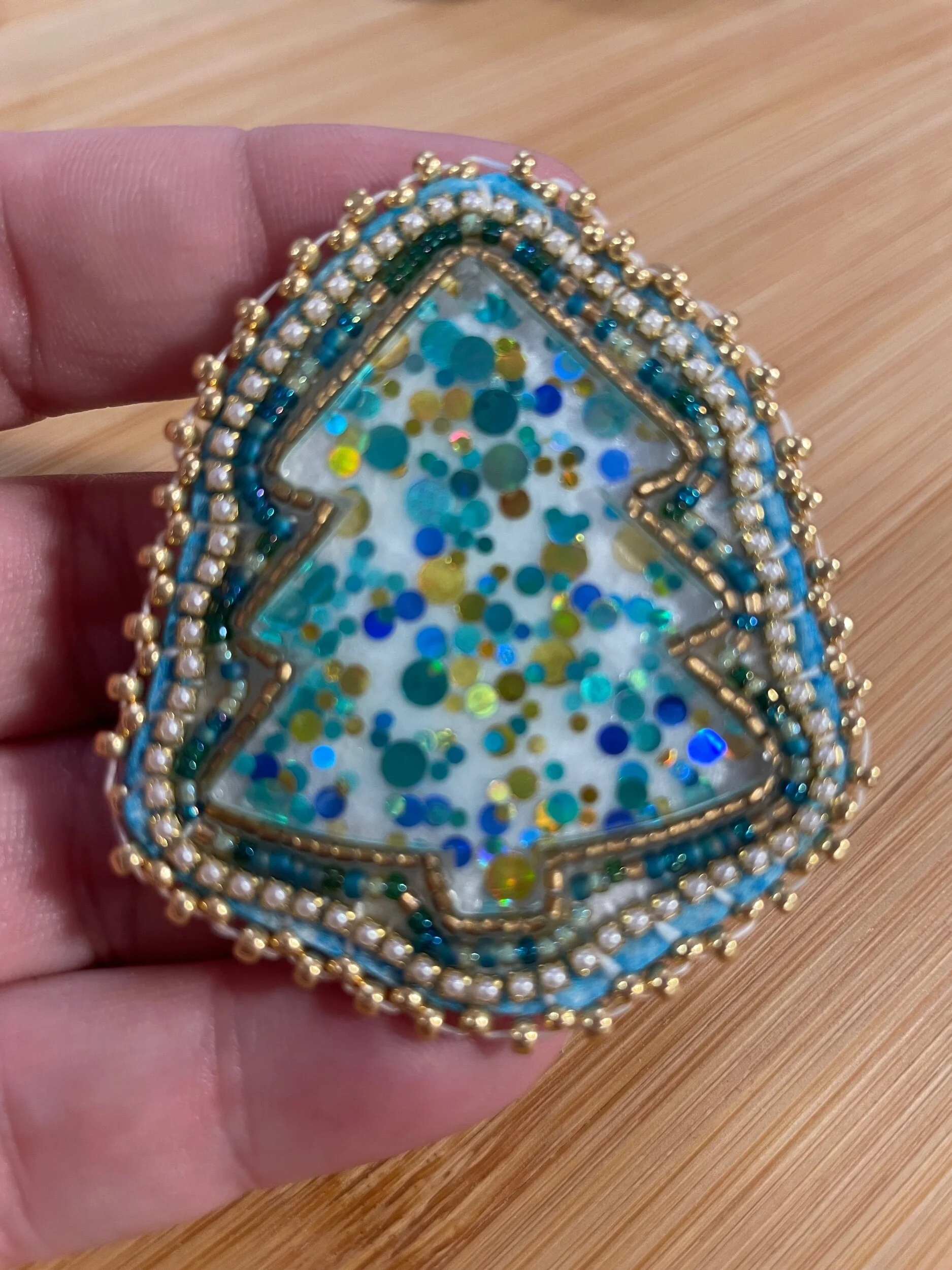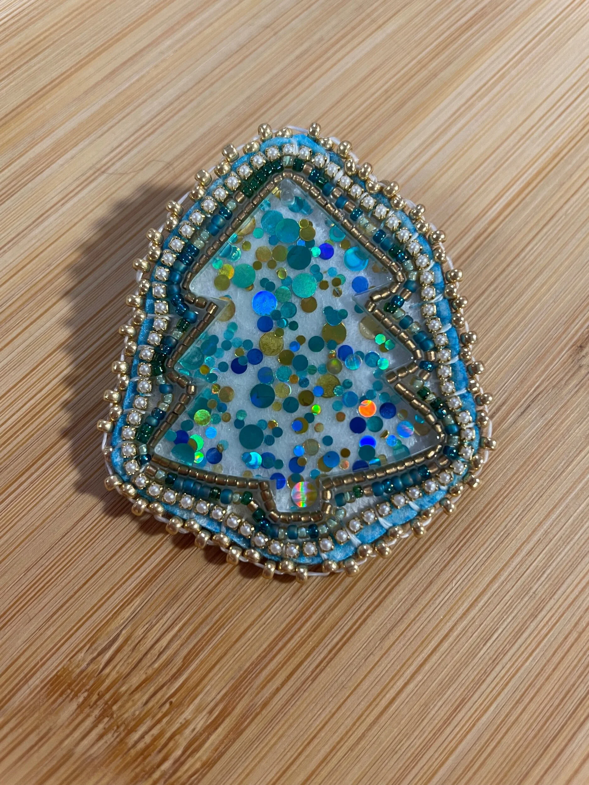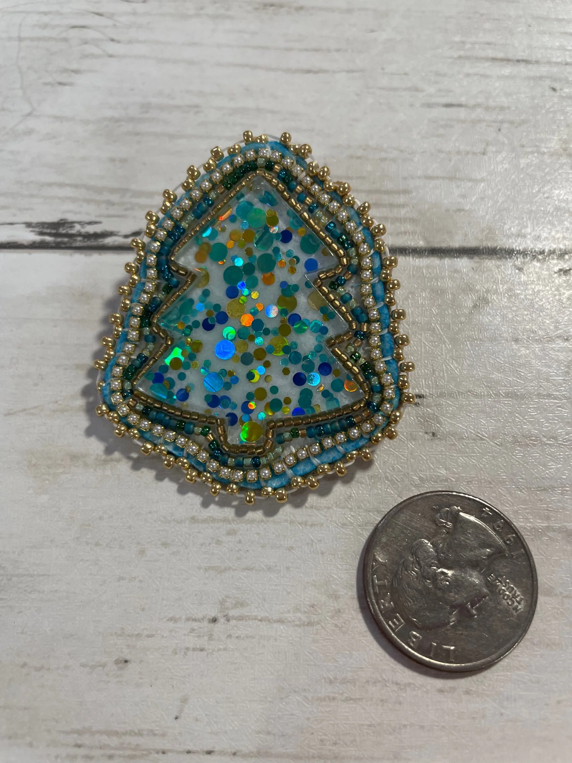 Shop › Beaded Christmas Tree Pin Image 1 of 5 Image 2 of 5 Image 3 of 5 Image 4 of 5 Image 5 of 5 Beaded Christmas Tree Pin $25.00 One of a kindLightweight Made with sz 15 seed beads and pearl banding Add To Cart Added! One of a kindLightweight Made with sz 15 seed beads and pearl banding